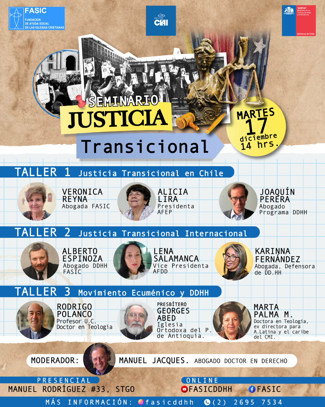 Santiago | El martes 17 de diciembre, se desarrolló el Seminario “Justicia Transicional” en nuestra casa y Sitio de Memoria. El encuentro organizado en conjunto entre FASIC, -Fundación de Ayuda Social de las iglesias cristianas-, y CLAI, -Consejo Latinoamericano de Iglesias-, fue conducido por Gloria König, colaboradora permanente, y moderado por Manuel Jacques, miembro del Directorio de Chile Sustentable, abogado y autor de numerosas publicaciones en temas de Justicia y Medio Ambiente.