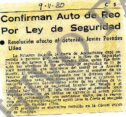 La Corte de Apelaciones deja sometido a proceso a Javier Paredes Ulloa, quien siendo detenido por la fuerzas de seguridad, es acusado de infringir la Ley de seguridad Interior del Estado y el Decreto Ley N.o 77. El Mercurio 09.05.1980
