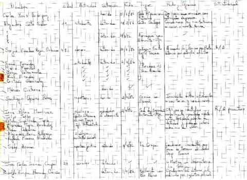 Sábana con registros individuales de detenciones arbitrarias. Detalla nombre individual de las personas, profesión, edad, fecha y lugar de los hechos, organismo responsable, acción judicial, cargos, fecha liberación/encarcelamiento, y observaciones varias. Marzo-abril 1986.
